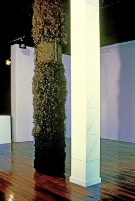 Description: Caryatid reconfigures a type of column which supported classical architecture. However unlike the classical column, Caryatid stands free. The work is positioned in the gallery space, in relation and adjacent to a square concrete column built near the centre of the room, supporting the gallery's architecture. On the four surfaces of this column is drawn a grid of black lines. The artist's research visit to Paestum and Pompeii included photographing the caryatids at Hadrian's Villa in Rome. She pursued her interest in the similarities and differences between the lives of women in early and contemporary cultures, as found in artifacts, symbols, and myth. For example the column or tree in matrilineal cultures marked the Asherim, the place where the Goddess was worshipped, simultaneously referencing the healing powers of Artemis caryatid. While the religious constructs were dismissed by the artist, the underlying respect for nature was noted as similar to contemporary thinking.