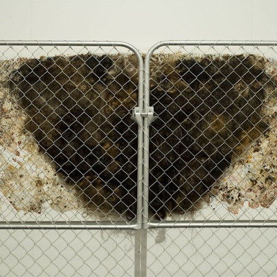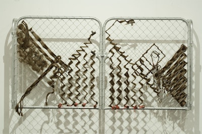 4. Processual Ground : Short, curly hair is loosely entwined and tied into a Cyclone gate. Some longer hair is pulled taught over the gate.