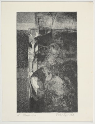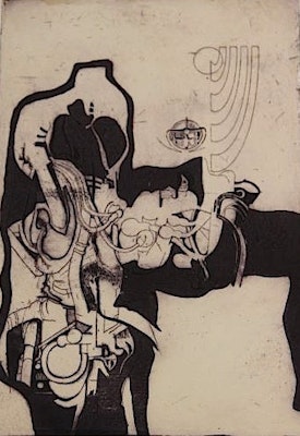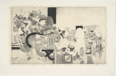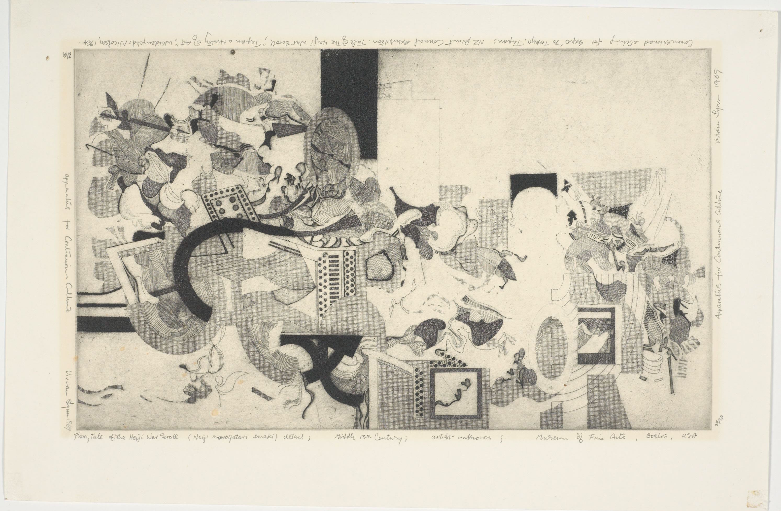 Apparatus for continuous culture: Exhibited 1970 - Osaka, Japan. Etching with aquatint and appropriated and abstracted 13th century scroll of "Tale of the Heiji War" Museum of Fine Arts, Boston, USA. Commissioned etching for Expo '70 Osaka, Japan, NZ Print Council.