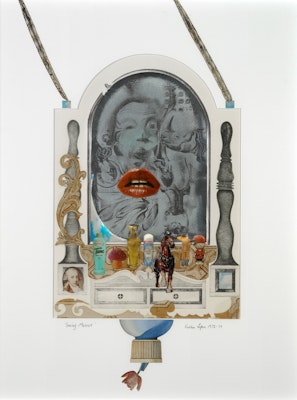 Description: Amalgam: lithographic print, chine colle, shaped mount is one of a series of works titled Amalgam: Mirror series. The series of prints which form the made using etchings and lithographs executed in USA in 1972 and he shaped mounts were made when
