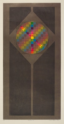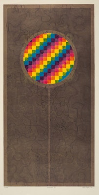 In the late 1960s Lynn moved away from the highly technical traditional mediums she had used, to explore more democratic materials and processes (processes that were easily available and inexpensive). Whereas contemporary conversations concerning NZ art focused on constructing a national identity through the land and its fauna, Lynn engaged a global conversation concerning the nature of identity, which she proposed as"difference" through her notion of mutating and/or "multiple Is"(identities). Consequently in 1970 she printed Spectrum taking as its signifying form, the lower case letter 'i' ----a sign used by children. The sign mutates through each of the six prints, it's meaning embodied in the process, construction, materials and use of the low tech medium Collagraphy. The collage process taught to children is also called colour relief printing.