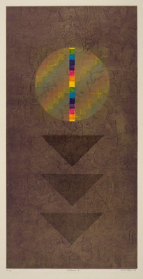 The spectrum / circle has an overlay of translucent gold which is different in each print.
