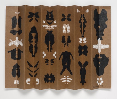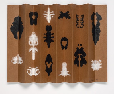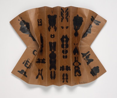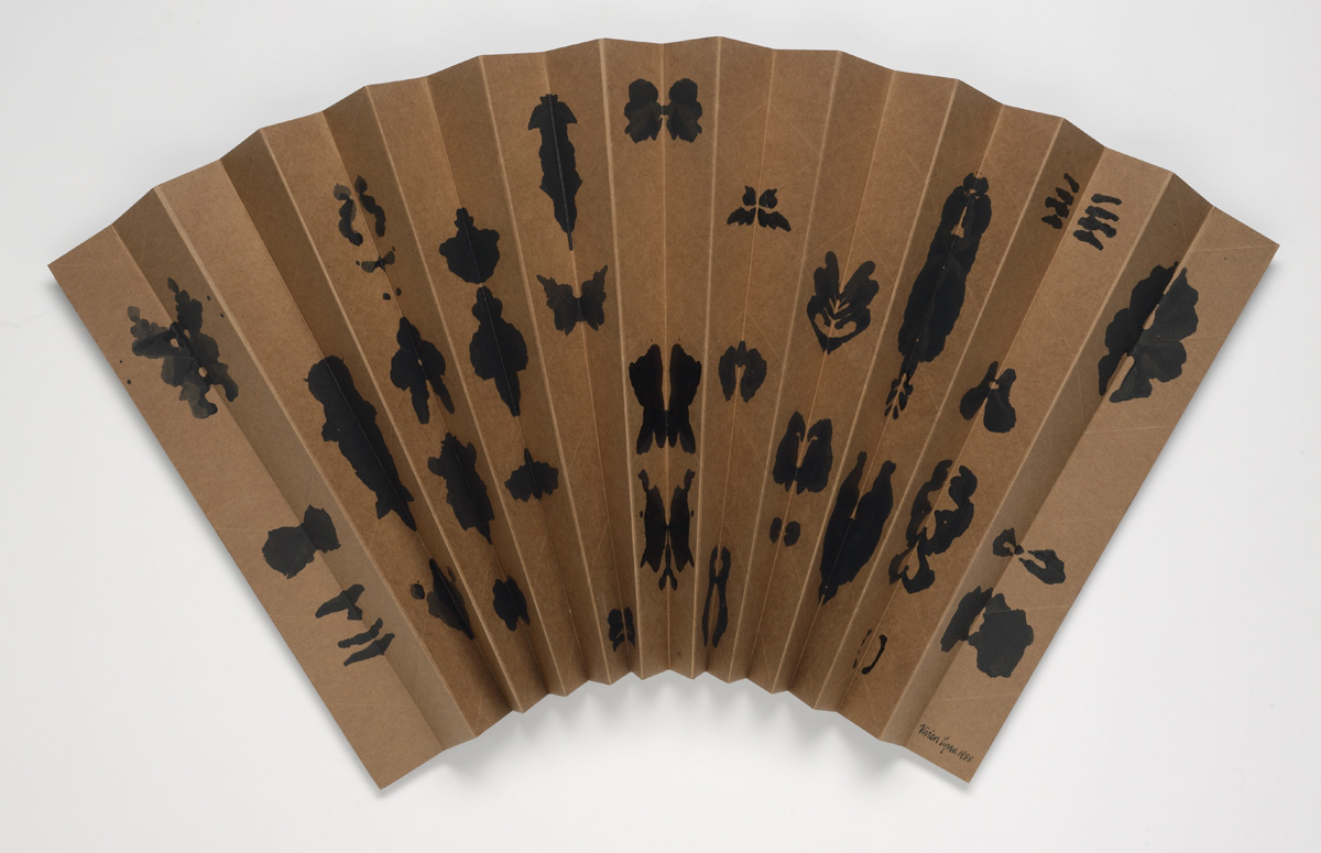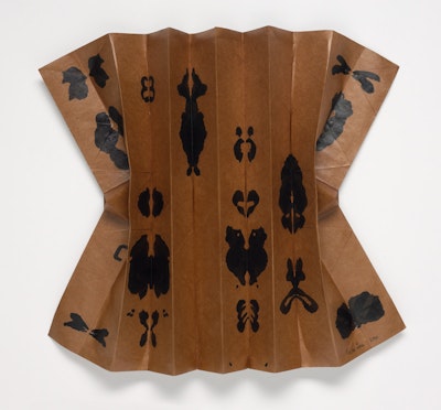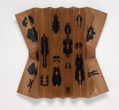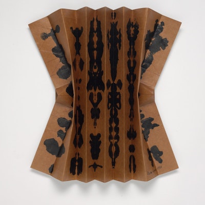 Description: The work: constructed from brown Wibilin paper, the surface of which is scored and folded into a double fan shape, folded and compressed into the centre; black ink blots are an integral part of the surface construction; the surface is varnished with polymer varnish containing UVLs.